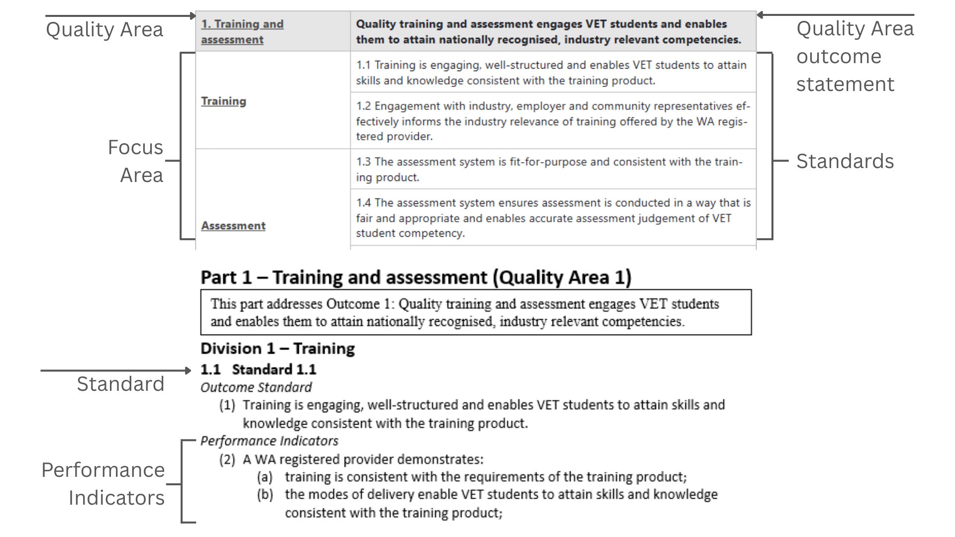 For each Quality Area, there are a number of focus areas, comprising one or more outcomes-focused standards. Each standard comprises a set of performance indicators, which set out the things an RTO must demonstrate to meet the standard.