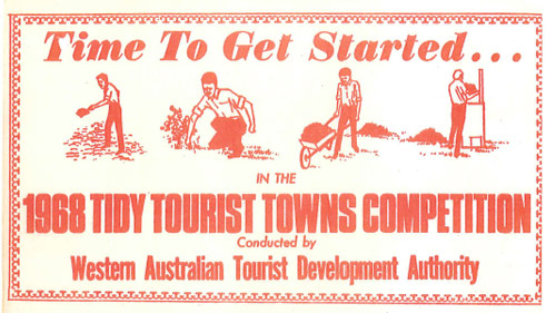 Tidy Towns in WA emanated from an Irish project, ‘Tidy Towns & National Roadside Gardens Competition’ after R.H. Hiller, the Director of the WATDA was contacted by an agent from the Irish Tourist Board, based in Sydney. The agent stated they 'had problems much the same as your own in bringing about the development of transport, accommodation, amenities, and of tourist attractions, on the scale required by the traveller of today' and offered to share information on their own initiative and its well received success.