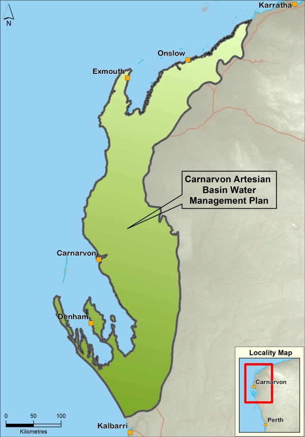 The Carnarvon Artesian Basin water management plan area is about 540 kilometres north of Perth and covers 115,000 km2. The basin stretches along the coast in the state's Mid West, extending from close to the Murchison River in the south, to the mouth of the Fortescue River in the north.