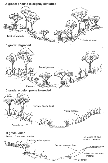 Pen and Scott (1995) developed a foreshore condition assessment system for farming areas in south-west Australia. The foreshore condition assessment system considers elements such as vegetation health, presence of weeds, livestock access and fencing status, bank steepness and potential for erosion. Foreshores are given a grade reflecting the level of degradation found (see Figure 1 below). Later this second method was developed for assessing foreshore condition in urban and semi-rural areas.
