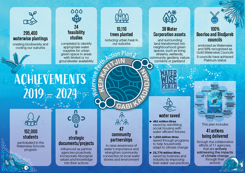 Kep Katitjin – Gabi Kaadadjan Waterwise Perth Action Plan 2 was delivered through the collaborative efforts of 11 agencies – the Department of Water and Environmental Regulation; Water Corporation; the departments of Biodiversity, Conservation and Attractions; Education; Communities; Finance; Planning, Lands and Heritage; Local Government, Sport and Cultural Industries; and Primary Industries and Regional Development; DevelopmentWA; and METRONET.