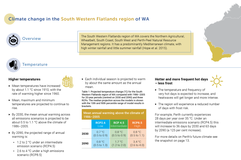 The Western Australian Climate Projections Summary provides easy-to-interpret summary information of climate projections for WA's major geographic regions.